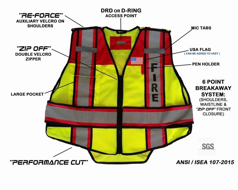 fire ninja safety equipment the home of the double breakaway zipper which allows the vest to breakaway from both sides, making it a 6 Point Breakaway vest. The Reflective Double Chevron performance cut offers max comfort and allows access to bunker gear pockets or portable radio at the waistline. Meets and Exceeds ANSI/ISEA 107-2020 safety vest standards.